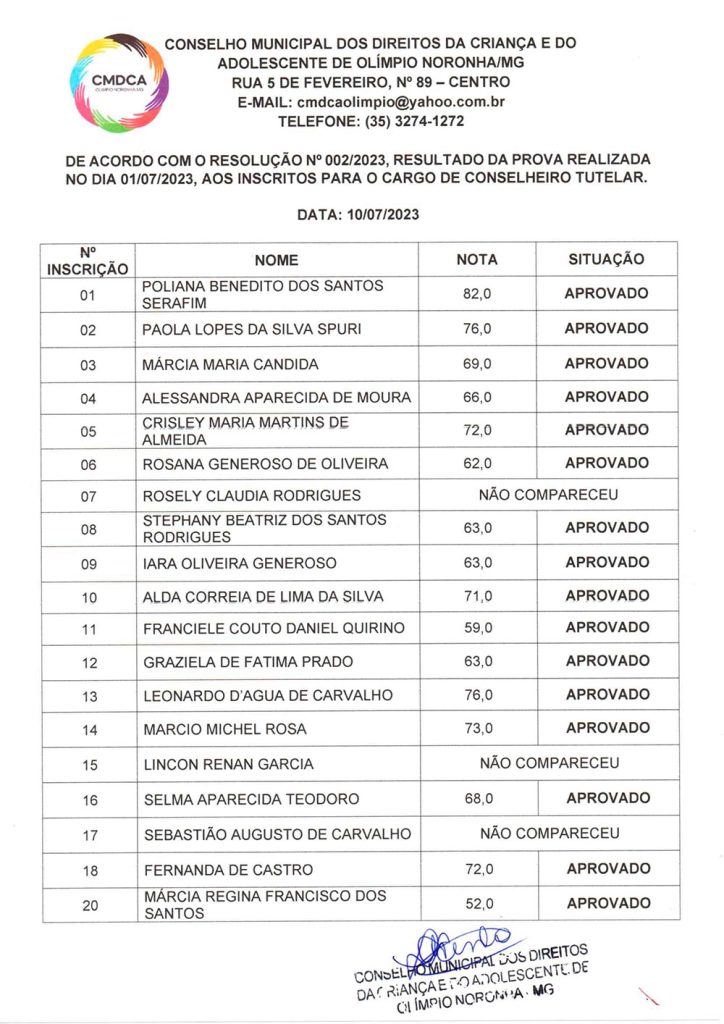 Lista de Aprovação para o Cargo de Conselheiro Tutelar