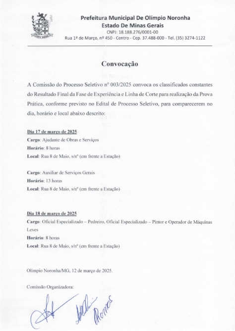 CONVOCAÇÃO PROCESSO SELETIVO 003-2025
