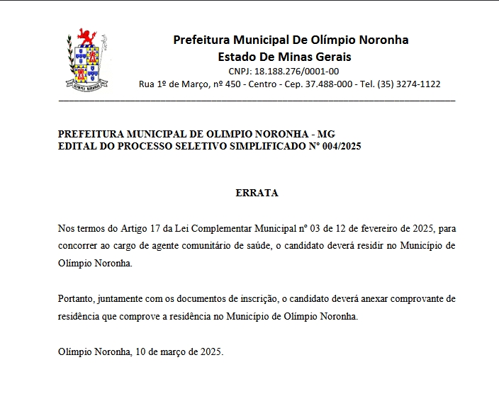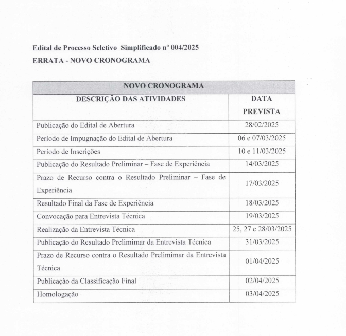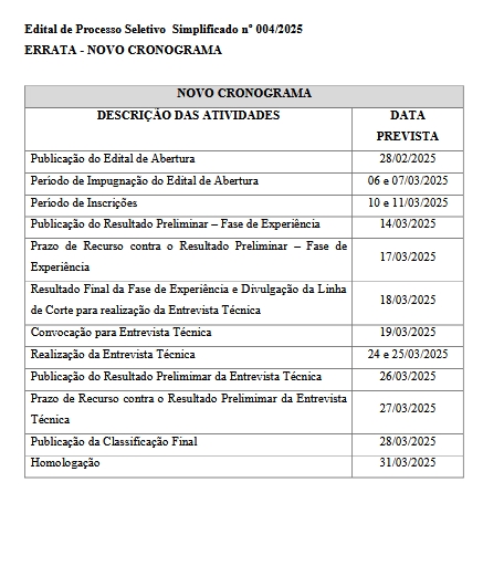 ERRATA – NOVO CRONOGRAMA – Edital de Processo Seletivo Simplificado nº 004/2025