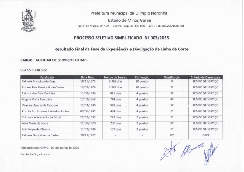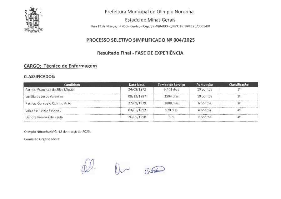 RESULTADO FINAL – FASE DE EXPERIÊNCIA PROCESSO SELETIVO SIMPLIFICADO Nº 004-2025