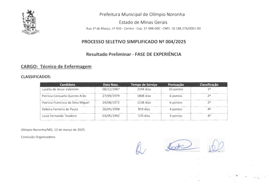RESULTADO PRELIMINAR DO PROCESSO SELETIVO Nº 004-2025