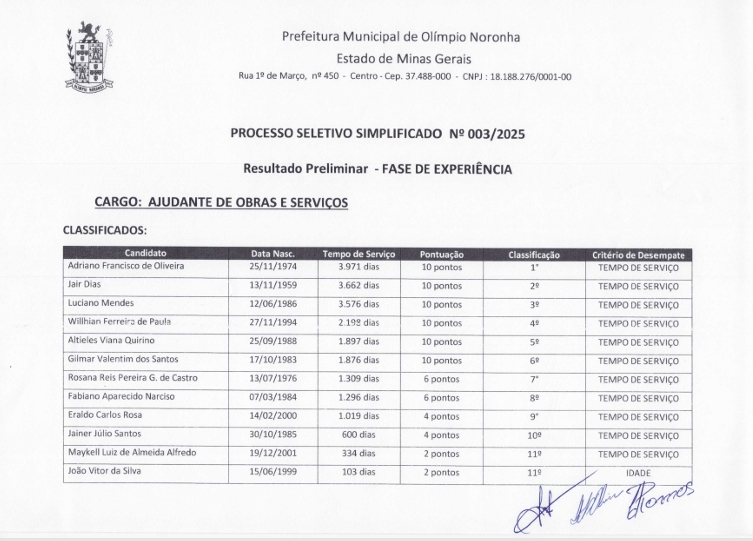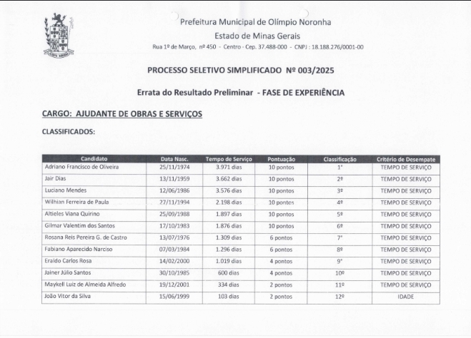Resultado Preliminar – Fase de Experiência (ERRATA) Processo Seletivo n° 003-2025
