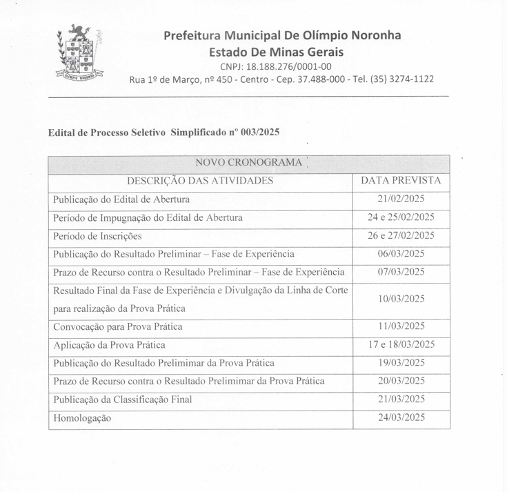 NOVO CRONOGRAMA – EDITAL DE PROCESSO SELETIVO SIMPLIFICADO Nº 003/2025