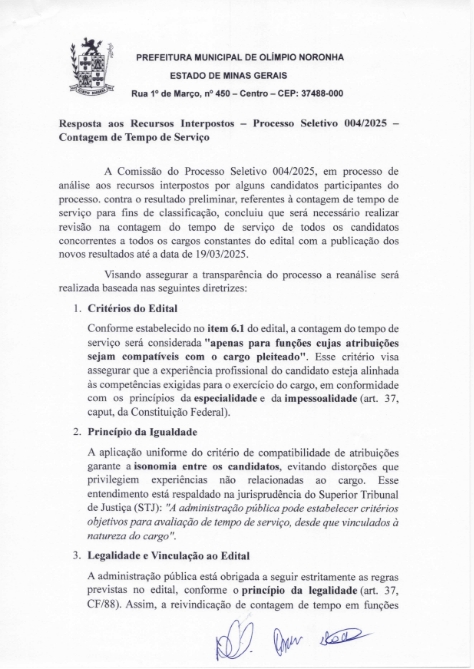 RESPOSTA AOS RECURSOS INTERPOSTOS – PROCESSO SELETIVO 004-2025 – CONTAGEM DE TEMPO DE SERVIÇO